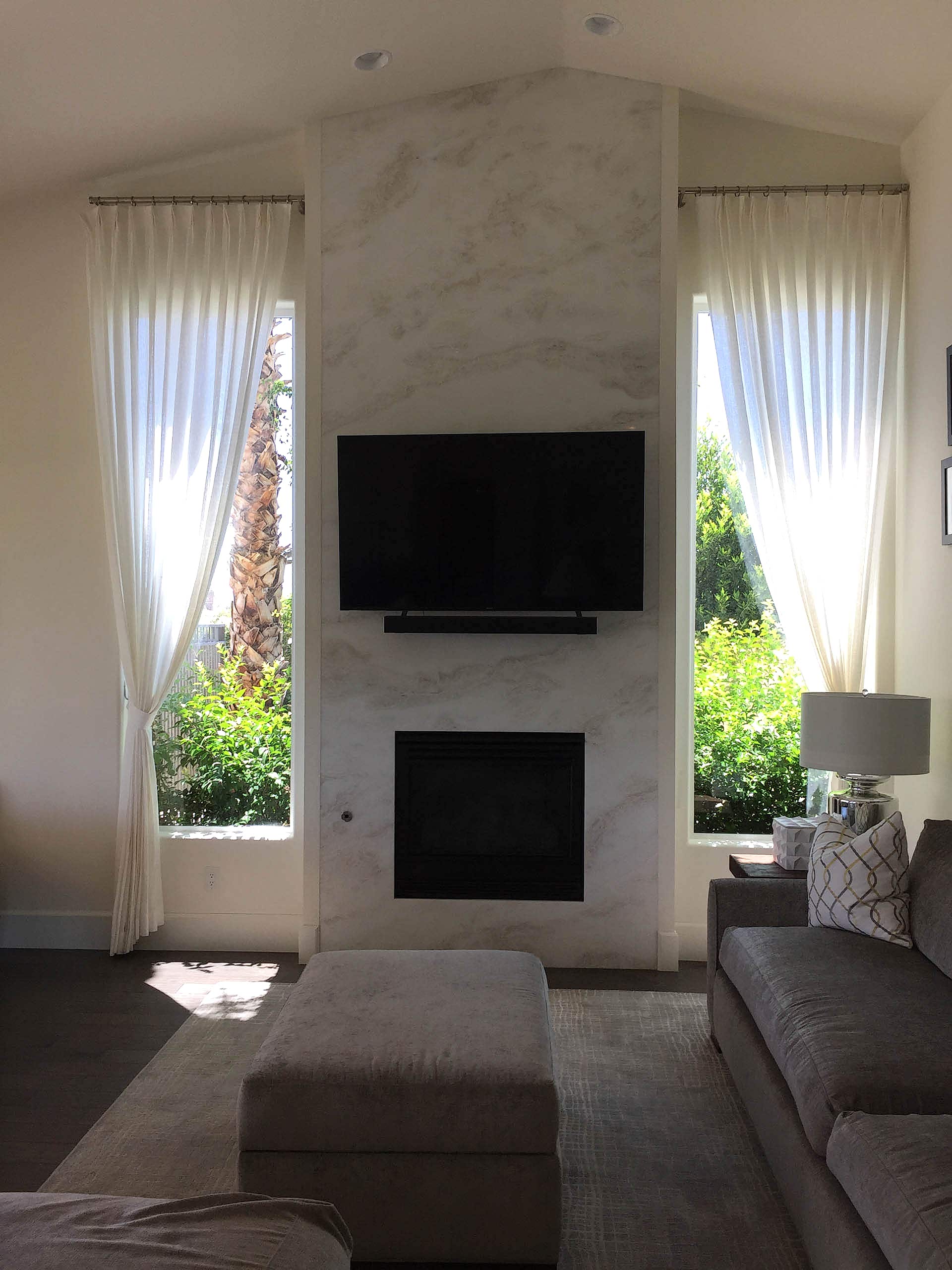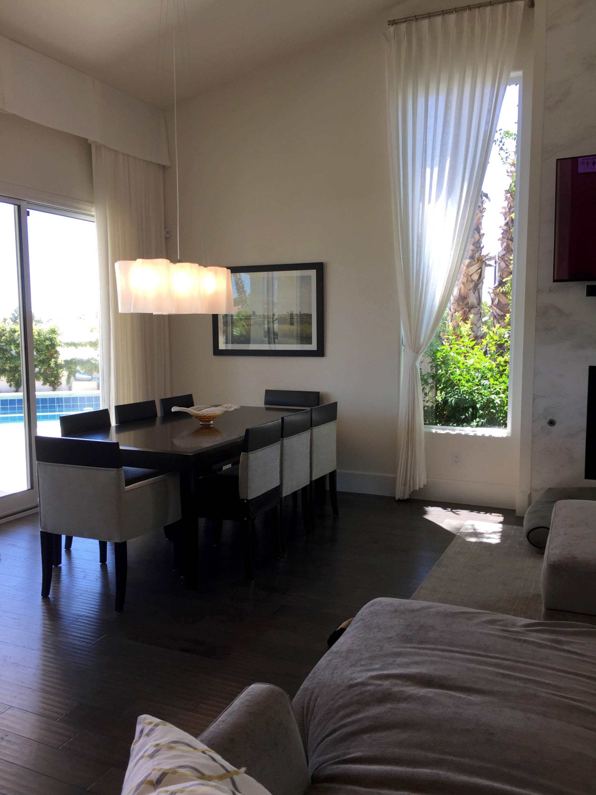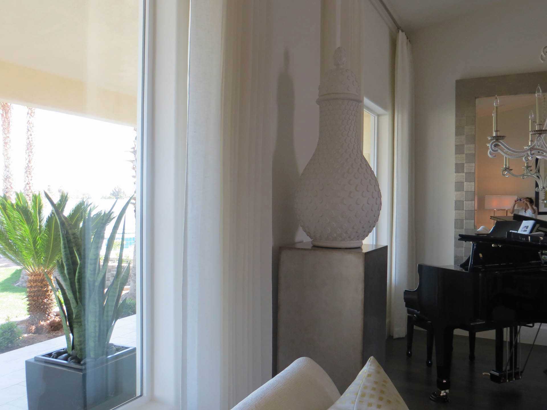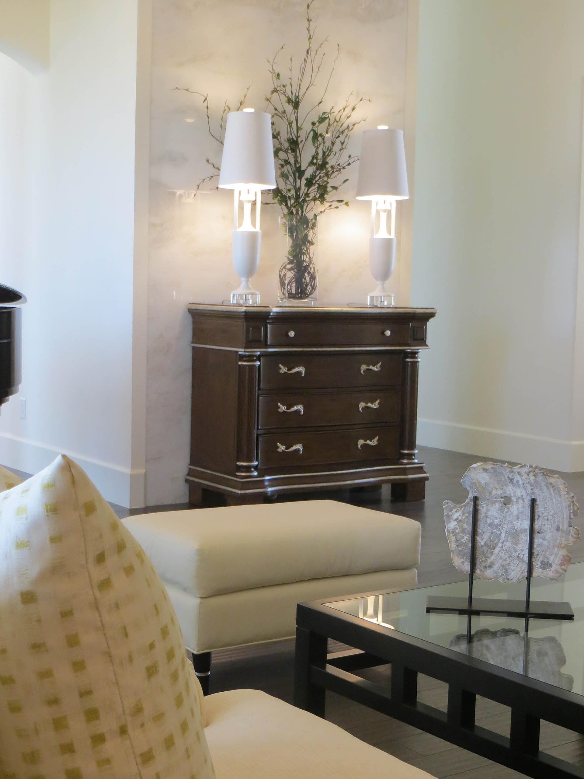 The owners purchased this Las Vegas custom home and immediately retained GDG to provide a complete remodel of the interior and exterior, including the entire landscaping. The clients expressed their desire for an abundance of natural light as part of the interior design. To achieve this, we added new windows in the Master Bedroom. In main living areas, we increased existing window dimensions, both vertically and horizontally, and specified a wall-to-wall, floor-to-ceiling operable window wall, to open out from the Dining Room onto the loggia and pool area. Brazilian white marble slabs with soft grey veining, fourteen feet high and five feet wide, cover two identical walls that are visually juxtaposed—one in the Formal Living Room and one in the Family Room. Virtually every piece of upholstered furniture, every table and cabinet in this home was custom designed by GDG, then manufactured and hand-finished by our partner craftsmen and artisans.