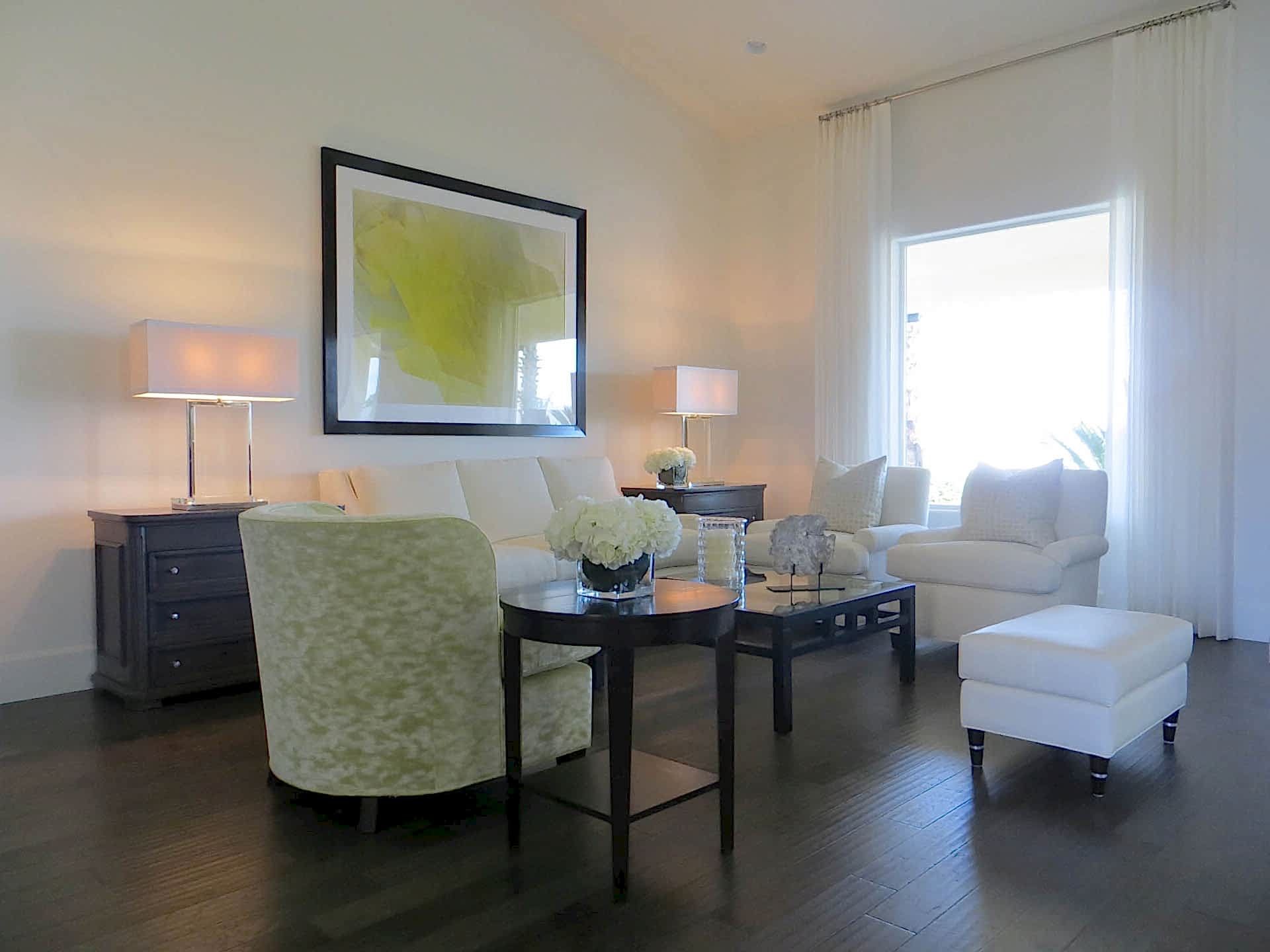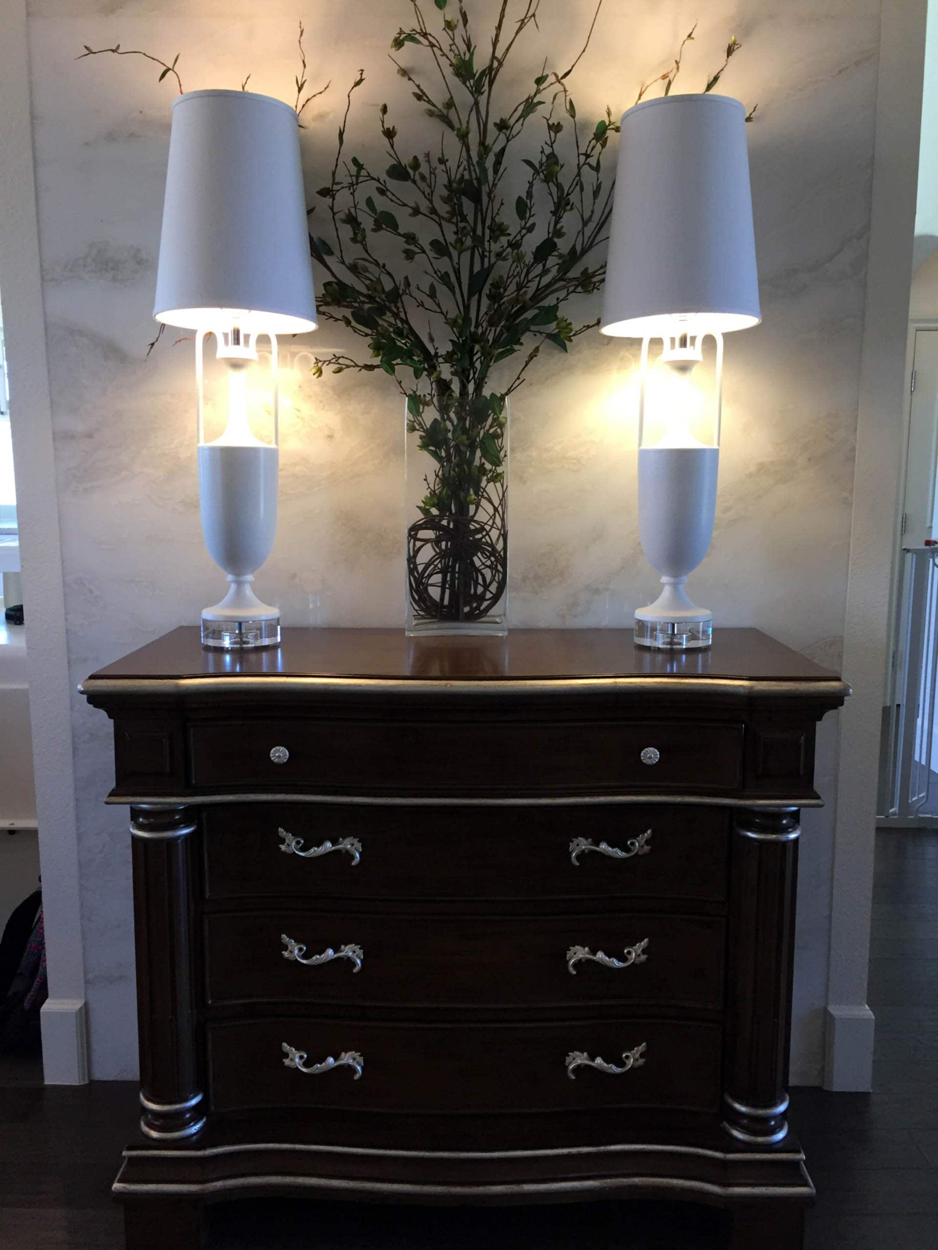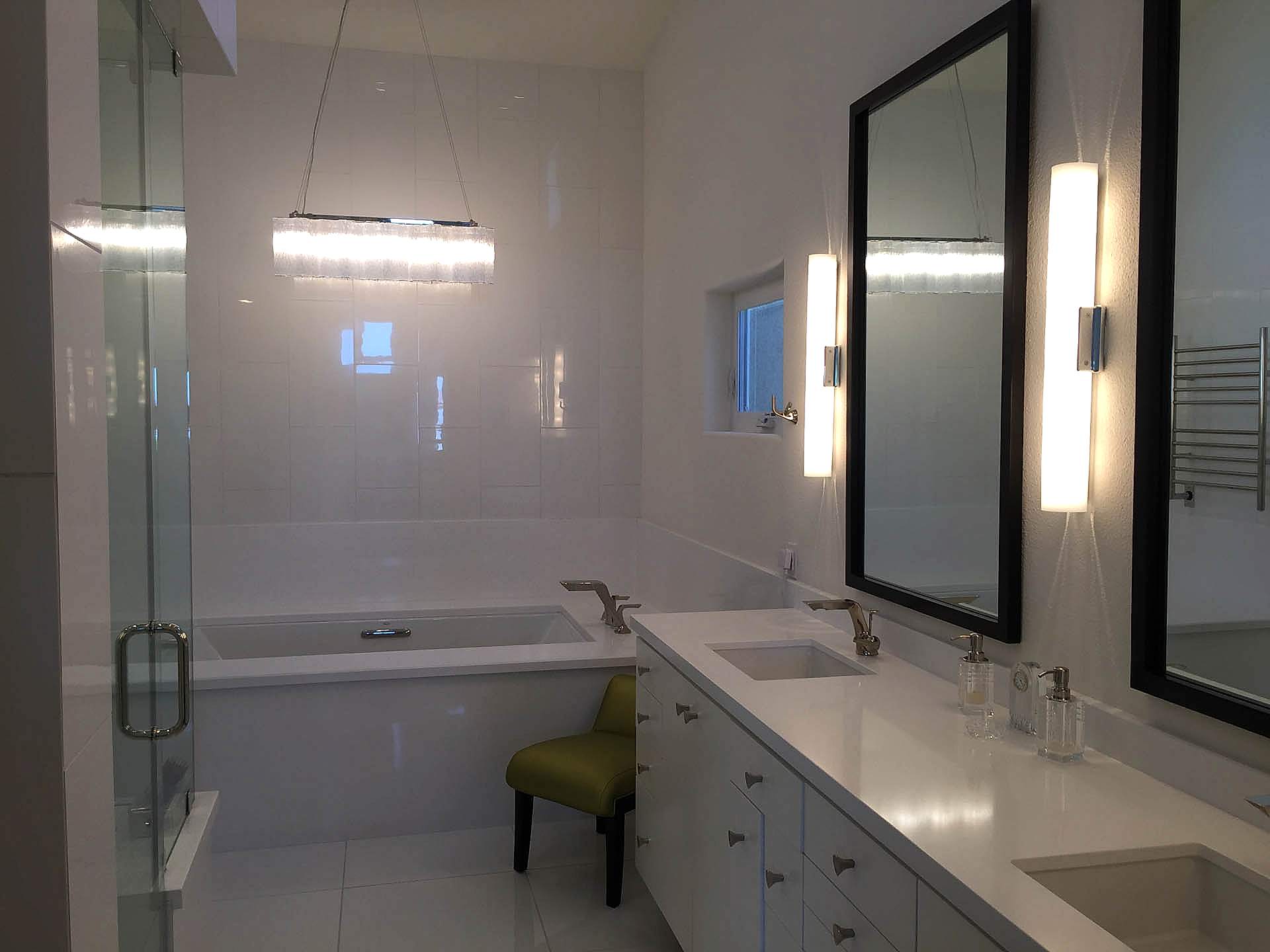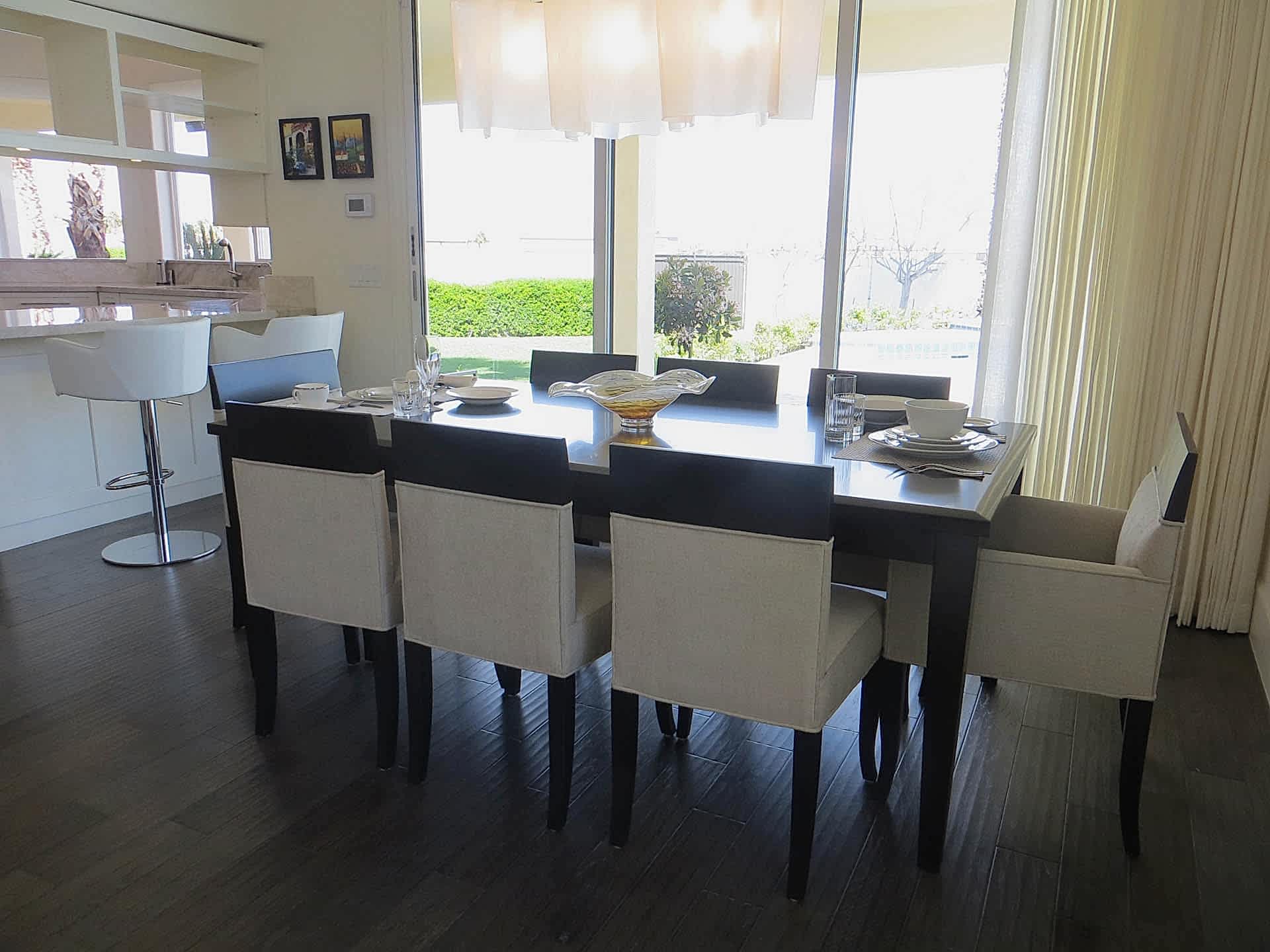 The owners purchased this Las Vegas custom home and immediately retained GDG to provide a complete remodel of the interior and exterior, including the entire landscaping. The clients expressed their desire for an abundance of natural light as part of the interior design. To achieve this, we added new windows in the Master Bedroom. In main living areas, we increased existing window dimensions, both vertically and horizontally, and specified a wall-to-wall, floor-to-ceiling operable window wall, to open out from the Dining Room onto the loggia and pool area. Brazilian white marble slabs with soft grey veining, fourteen feet high and five feet wide, cover two identical walls that are visually juxtaposed—one in the Formal Living Room and one in the Family Room. Virtually every piece of upholstered furniture, every table and cabinet in this home was custom designed by GDG, then manufactured and hand-finished by our partner craftsmen and artisans.