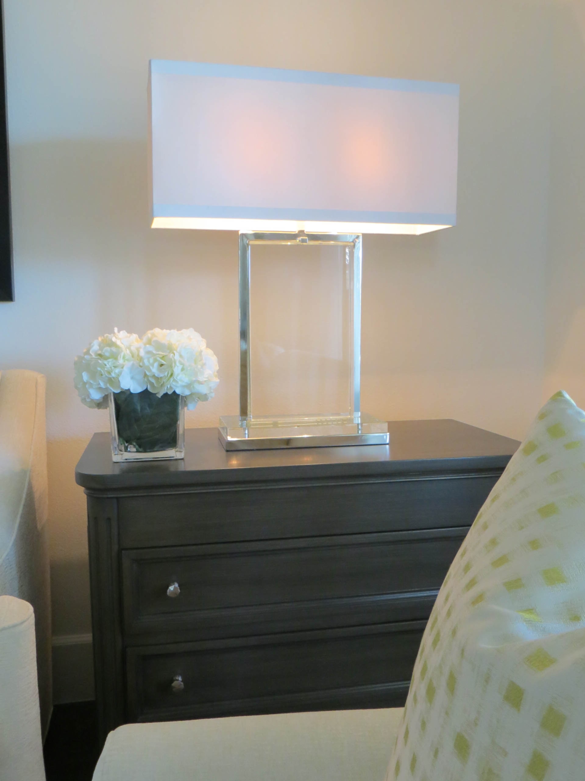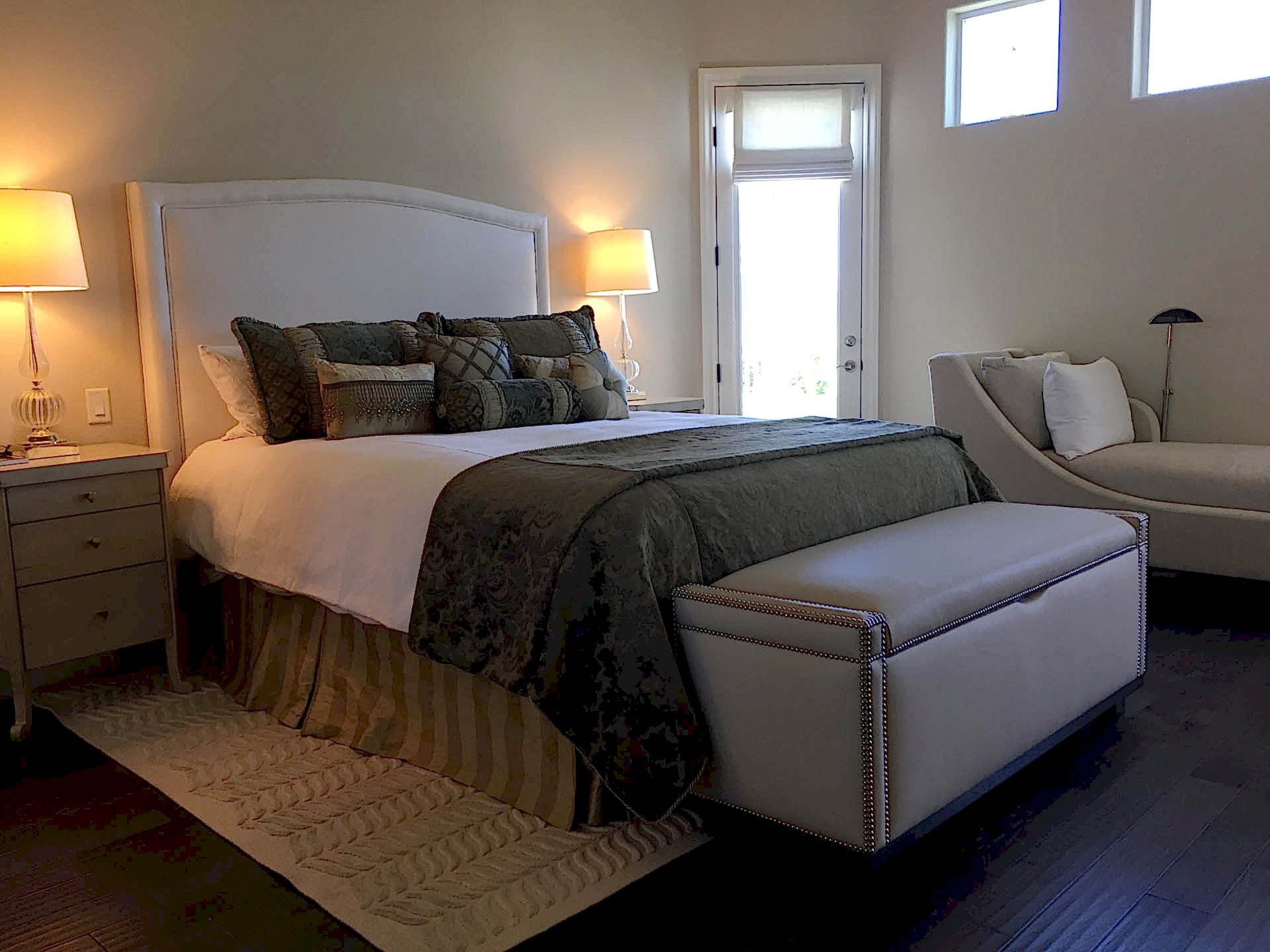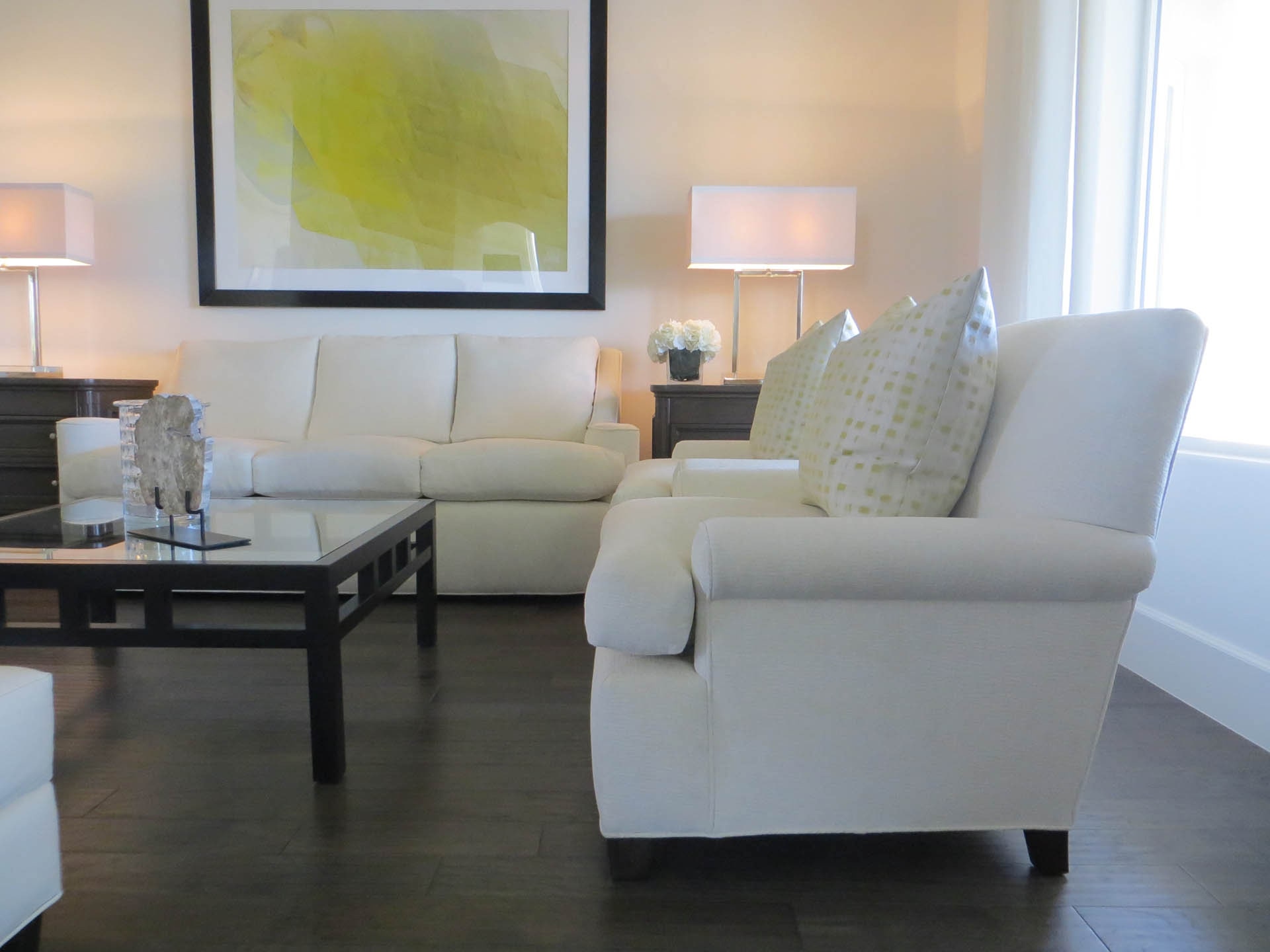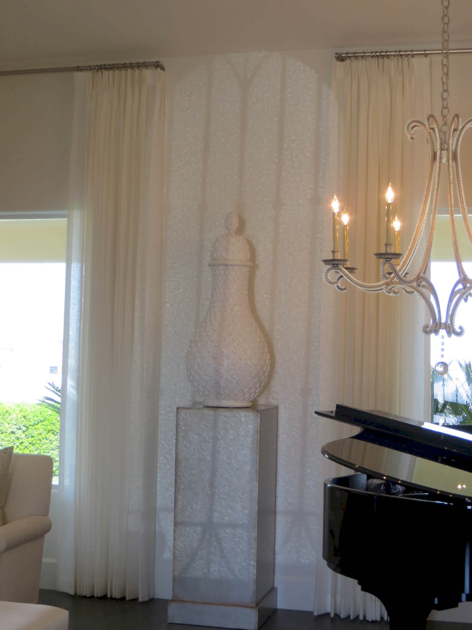 The owners purchased this Las Vegas custom home and immediately retained GDG to provide a complete remodel of the interior and exterior, including the entire landscaping. The clients expressed their desire for an abundance of natural light as part of the interior design. To achieve this, we added new windows in the Master Bedroom. In main living areas, we increased existing window dimensions, both vertically and horizontally, and specified a wall-to-wall, floor-to-ceiling operable window wall, to open out from the Dining Room onto the loggia and pool area. Brazilian white marble slabs with soft grey veining, fourteen feet high and five feet wide, cover two identical walls that are visually juxtaposed—one in the Formal Living Room and one in the Family Room. Virtually every piece of upholstered furniture, every table and cabinet in this home was custom designed by GDG, then manufactured and hand-finished by our partner craftsmen and artisans.